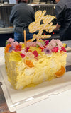This cake is a very elegant and artistic creation with a modern floral design in a rectangle size. It is covered in smooth, glossy white frosting with textured, sculpted swirls that give it a soft look. Decorated with seasonal fruits and fresh florals. (Florals are not edible, please remove before consuming.